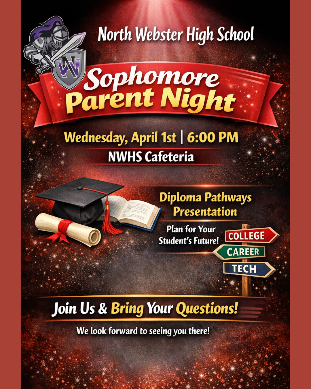 When the school was formed in 2011, a new school name, mascot, and colors were all chosen by the students who would make up the school. The school was named North Webster High, with purple, black, and silver being the school colors, and the school mascot being the Knights. During the summer of 2011, excitement filled all of North Webster Parish as the new NWHS students “painted the landscape” purple.